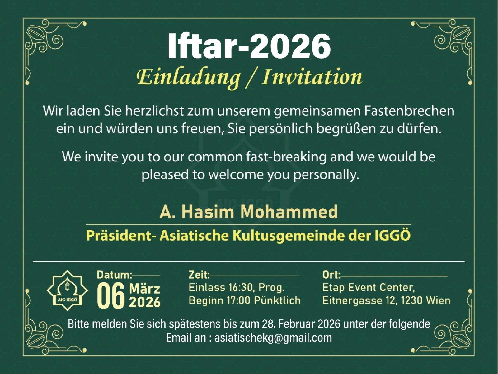 স্বাগত বক্তব্যে জনাব হাসিম এশিয়ান মুসলিম কমিউনিটির গুরুত্বপূর্ণ উক্ত ইফতার অনুষ্টানে উপস্থিত হওয়ার জন্য ইসলামিক রিলিজিয়াস অথরিটি ইন অস্ট্রিয়ার প্রেসিডেন্ট জনাব অমিত ভুরাল, বাংলাদেশী রাষ্ট্রদূত জনাব তৌফিক হাসান, ভিয়েনা ভিন্সিয়াল পার্লামেন্ট মেম্বার ও ভিয়েনার মেয়র ডঃ মিকায়েল লুডভিগ এর প্রতিনিধি আসলিহান বজাতেমার, ভিয়েনা প্রভিন্সিয়াল পার্লামেন্ট মেম্বার .ইঞ্জিনিয়ার ওমর আল রাবী, অস্ট্রিয়ার প্রধান মুফতি মুস্তাফা মুল্লওগ্লু, ইন্দোনেশিয়ান এম্বাসীর ডেপুটি চিফ জনাব বিট্টু তাহার , মালয়েশিয়ান এম্বাসীর ডেপুটি চিফ জনাব রিডজওয়ান সাহাবুদিন, শ্রীলঙ্কান এম্বাসীর ডেপুটি চিফ জনাব মাহেশ গুনাবরদানা, উজবেকিস্তান এম্বাসীর ডেপুটি চিফ জনাব আব্বসবেক এডিলিভ, অস্ট্রিয়ান ফেডারেল চ্যান্সেলারির প্রতিনিধি জনাব চেঙ্গিজ ডুরান, অথরিটির প্রাক্তন সভাপতি ডক্টর আনাস শাকফে, ডক্টর ফুয়াদ সনাক, টার্কিশ ফেডারেশন এর প্রেসিডেন্ট জনাব আলী চান,ইউনিয়ন অফ ইন্টারন্যাশনাল ডেমোক্র্যাটস অস্ট্রিয়ার প্রেসিডেন্ট জনাব মাহমুদ কোচ, সৌদি সরকার পরিচালিত ভিয়েনা ইসলামিক সেন্টারের পরিচালক ডক্টর আহমেদ আল মফারে, ভিয়েনা ইউনিভার্সিটির প্রফেসর ডক্টর জেকিরিয়া সেজদিনি, আন্তর্জাতিক পরমাণু শক্তি সংস্থার ডিরেক্টর জেনারেলের চিফ সায়েন্টিফিক এডভাইসর জনাব সায়েদ আশরাফ সহ সকল উপস্থিতিকে ধন্যবাদ জ্ঞাপন করেন।