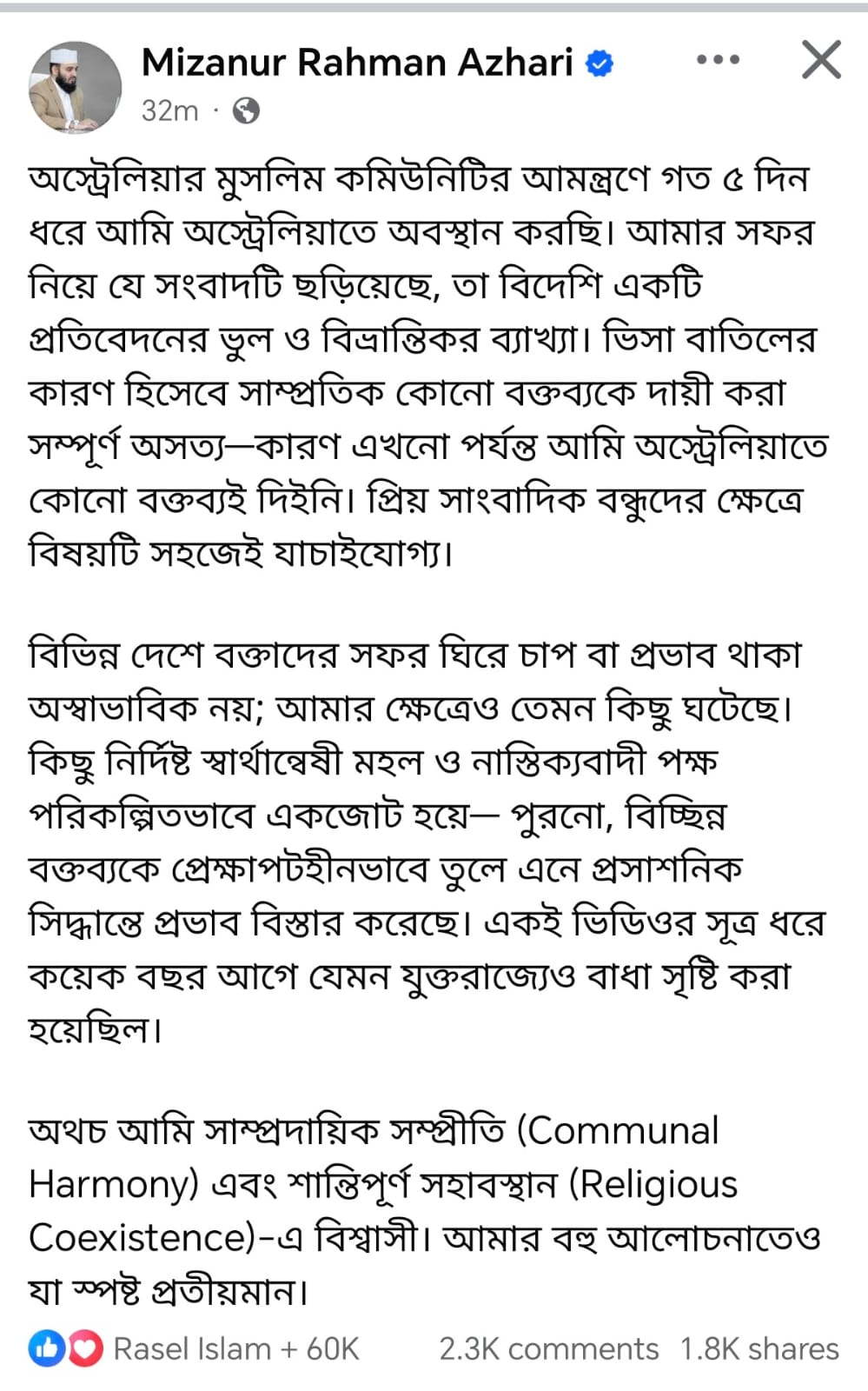 ” অস্ট্রেলিয়ার মুসলিম কমিউনিটির আমন্ত্রণে গত ৫ দিন ধরে আমি অস্ট্রেলিয়াতে অবস্থান করছি। আমার সফর নিয়ে যে সংবাদটি ছড়িয়েছে, তা বিদেশি একটি প্রতিবেদনের ভুল ও বিভ্রান্তিকর ব্যাখ্যা। ভিসা বাতিলের কারণ হিসেবে সাম্প্রতিক কোনো বক্তব্যকে দায়ী করা সম্পূর্ণ অসত্য—কারণ এখনো পর্যন্ত আমি অস্ট্রেলিয়াতে কোনো বক্তব্যই দিইনি। প্রিয় সাংবাদিক বন্ধুদের ক্ষেত্রে বিষয়টি সহজেই যাচাইযোগ্য।