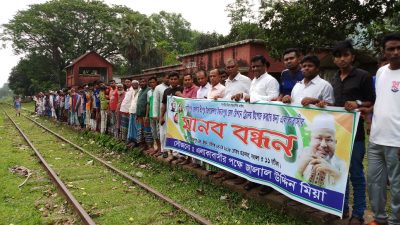 গাজীপুরের শ্রীপুর উপজেলার ইজ্জতপুরে বন্ধ রেল স্টেশন চালু ও ট্রেন স্টপেজের দাবীতে মানববন্ধন করেছে এলাকাবসী। শুক্রবার দুপুর ১২টায় ঢাকা ময়মনসিংহ রেল পথের ইজ্জতপুর রেল স্টেশেনে মানবন্ধনটি অনুষ্ঠিত হয়। মানবন্ধনে অংশ